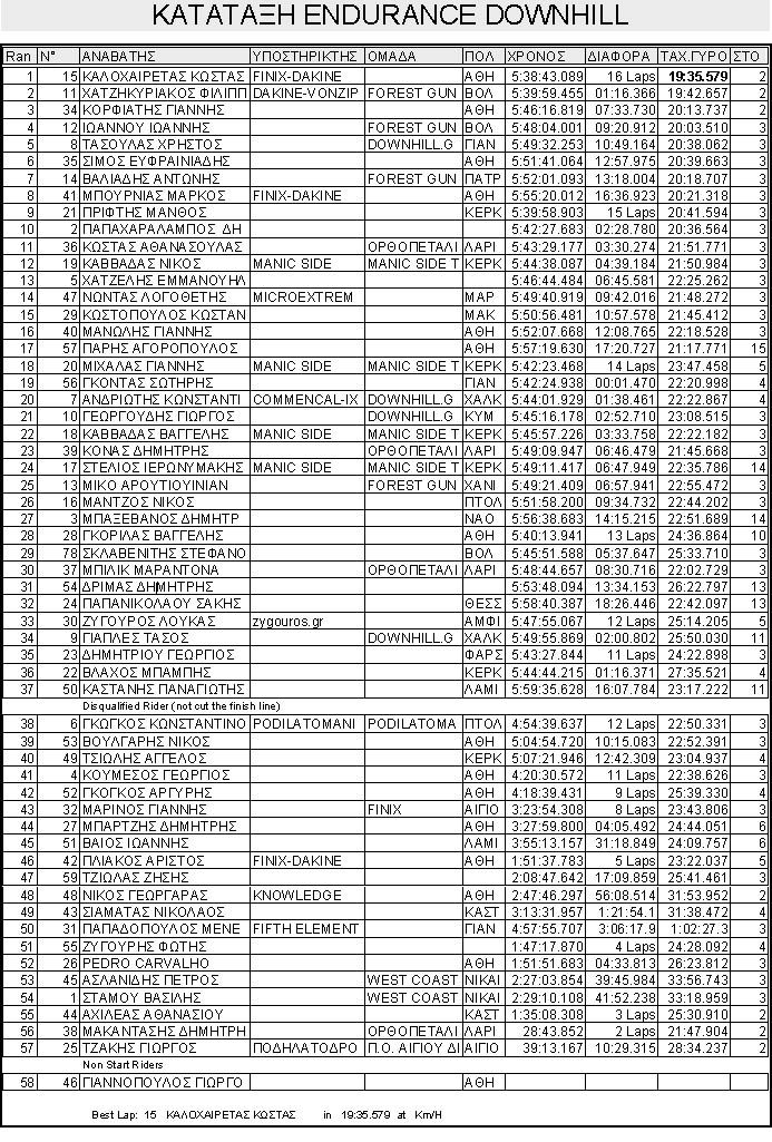 Νικητής του αγώνα αναδείχτηκε αντάξια ο Κωσταντίνος Καλοχαιρέτας με 16 καταβάσεις και χρόνο 5:38:43.089 την Κυριακή, ενώ το Σάββατο έκανε άλλες 10 όπως μας είπε, σύνολο 26 καταβάσεις σε 2 μέρες. Η κάθε κατάβαση αντιστοιχεί σε 500μ υψομετρικά άρα με ένα απλό πολλαπλασιασμό καταλήγουμε στα 13.000μ κατάβασης από τον πρώτο νικητή του Endurance Downhill 2010. Μόλις μερικά καρεκλάκια του lift μακρυά, δεύτερος τερμάτισε ο Φίλιππος Χατζηκυριάκος πάλι με 16 γύρους αλλά χρόνο 5:39:59.455. Τρίτος στην κατάταξη ακολούθησε ο Γιάννης Κορφιάτης με χρόνο 5:46:16.819, ο οποίος για ακόμη μία φορά μας απέδειξε πως είναι ένας allaround αθλητής. Νικήτρια ομάδα αναδείχτηκε η Forest Gun με άθροισμα γύρων τους 62. Στη δεύτερη θέση η ομάδα Manic Side (με τρέλα) απο τη Κέρκυρα, ενώ την τρίτη θέση κατέλαβε η ομάδα Downhill.gr.